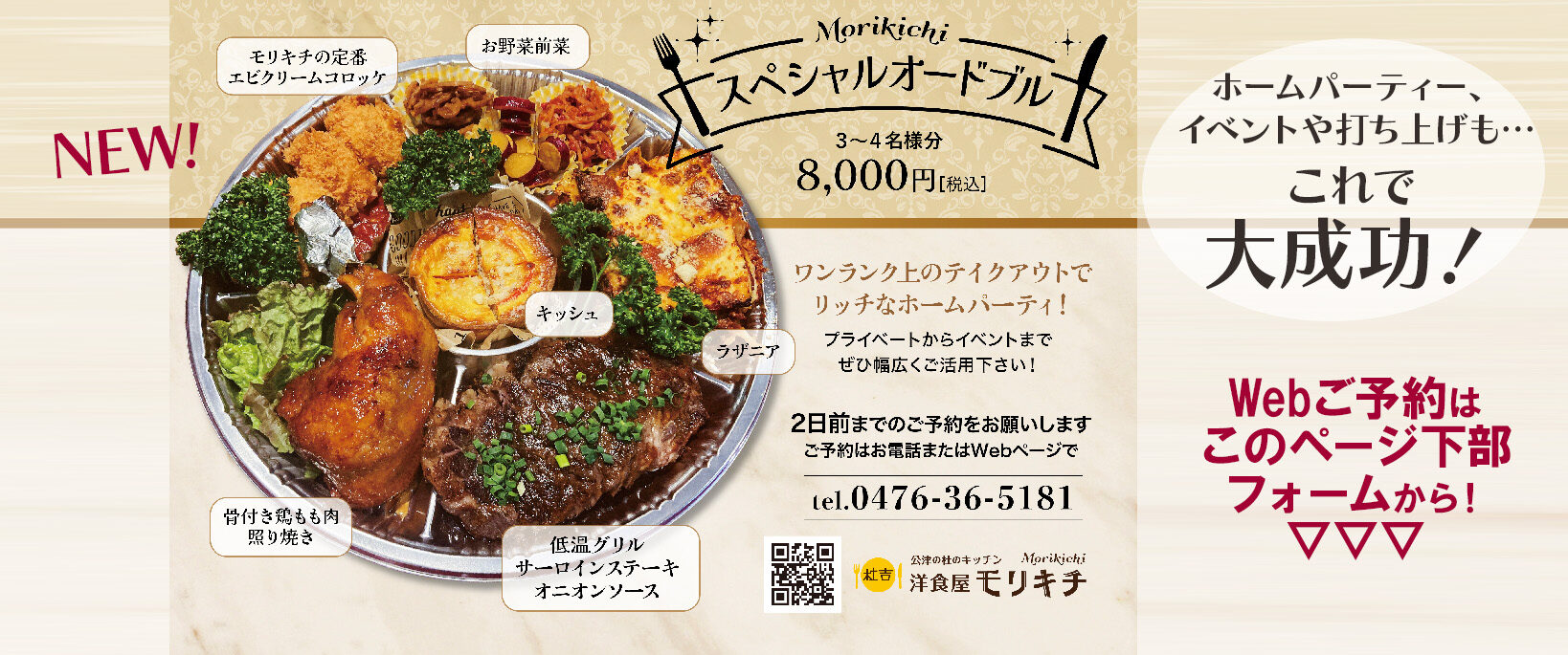 外食も楽しいけど、家食だって楽しい! ホームパーティを豪華に盛り上げるモリキチのオードブルはいかがですか? <子供たち・ご家族の楽しい思い出作り>をイメージしたオードブルです!3~4人前:¥5300(税込) メニュー…