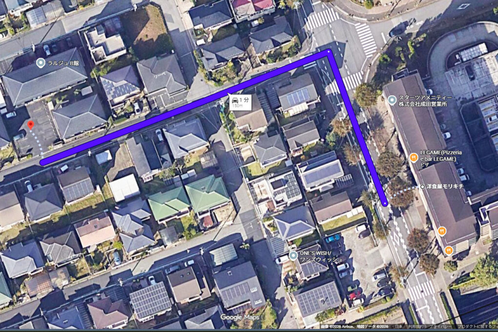 「モリキチ」を通りすぎ、公津の杜公園方向に坂を下っていき、ひとつ目の交差点を左折。しばらく進むと【公津の杜第8駐車場】がございます。(千葉県成田市公津の杜6丁目24-10)